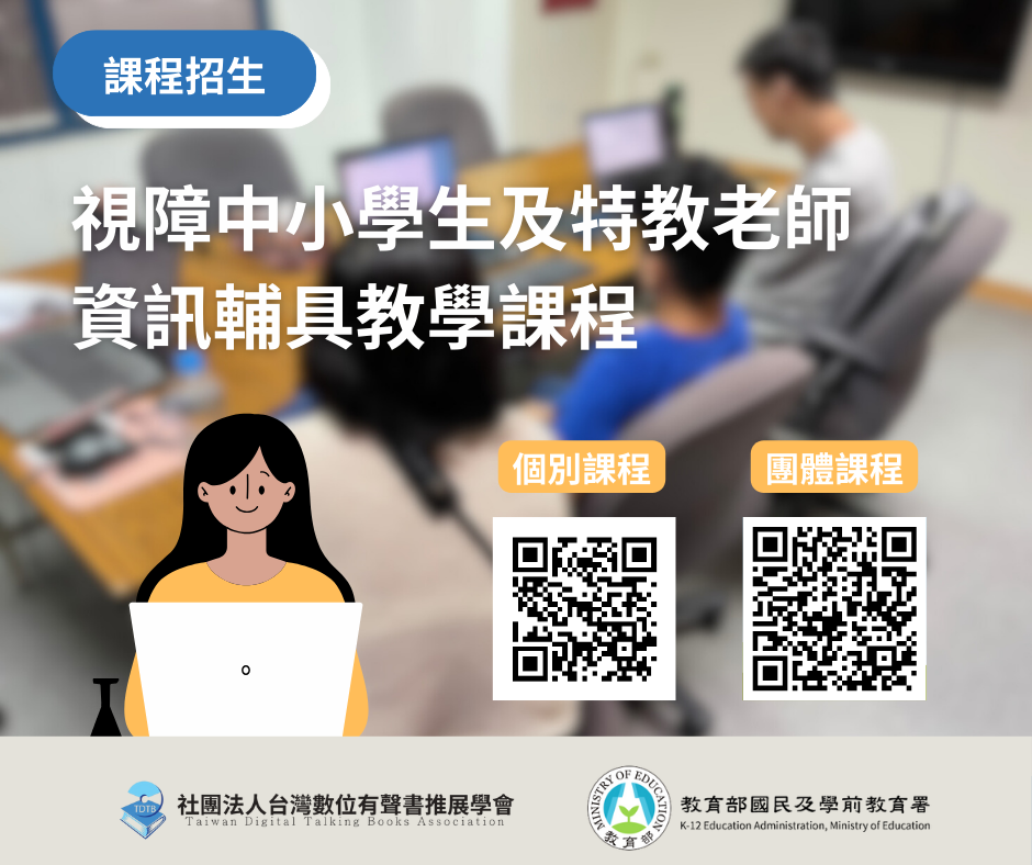 | 二、 | 為協助視障學子克服障礙,未來於就學、就業等層面獲得更公平之機會,該會於 114 年獲教育部國民及學前教育署補助辦理「向下紮根、向上提升─視障中小學生資訊教育計畫」,針對全國就讀於 1 至 12 年級領有身心障礙手冊之視覺障礙學生、其家長及特教或巡輔老師,提供一對一實體或遠距電腦教學及團體課程。 |